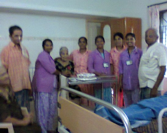 Mrs. Rosy Serrao celebrated her 66th birthday on October 7th, at Ave Maria Palliative Care. Picture shows Mrs. Serrao cutting her Black Forest Chocolate cake surrounded by Ave Maria staff and other patients.